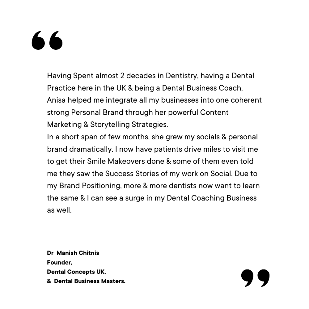 I am a practising Dentist, Speaker, Storyteller and an unshakable optimist helping Doctors & professionals reach their patients through harnessing the power of social media & marketing.